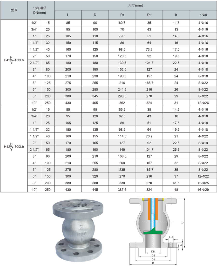 H42法蘭單瓣升降式止回閥主要尺寸及重量